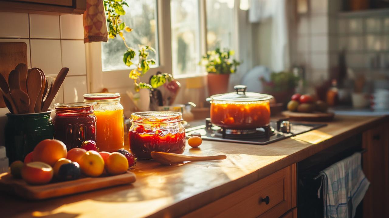Combiner intelligemment différents fruits permet de pallier les carences en pectine de certaines variétés. Associer des fraises pauvres en pectine avec des pommes ou quelques morceaux de coing garantit une meilleure gélification sans compromettre le goût principal recherché. Cette technique ancestrale s'avère particulièrement utile pour réussir des confitures de fruits rouges qui tendent naturellement à rester liquides. Les épices comme la vanille ou la cannelle, ainsi que certaines herbes aromatiques subtiles, peuvent sublimer vos créations en apportant une touche d'originalité. La préparation des pots constitue une étape aussi importante que la cuisson elle-même pour garantir une conservation optimale. Stérilisez soigneusement vos bocaux et leurs couvercles en les plongeant dans l'eau bouillante pendant au moins dix minutes. Cette opération élimine les bactéries susceptibles de compromettre la conservation de vos confitures. Remplissez les pots alors que la confiture est encore très chaude, en laissant environ un centimètre d'espace en haut du bocal. Fermez immédiatement les couvercles et retournez les pots pendant quelques minutes, technique qui crée un vide d'air favorisant la conservation. Étiquetez ensuite vos créations en indiquant la nature de la confiture et la date de préparation. Stockez vos bocaux dans un endroit frais, sec et à l'abri de la lumière directe pour préserver les qualités gustatives et nutritionnelles de vos confitures maison durant plusieurs mois.